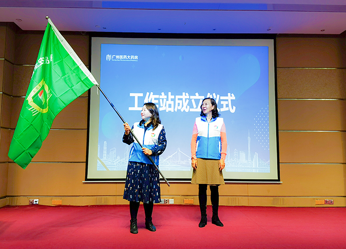 PSM廣東總站長吳新榮宣布廣州醫(yī)藥大藥房工作站成立,向工作站授旗并為志愿者代表佩戴徽章。100多名志愿者通過線上直播參與成立大會。